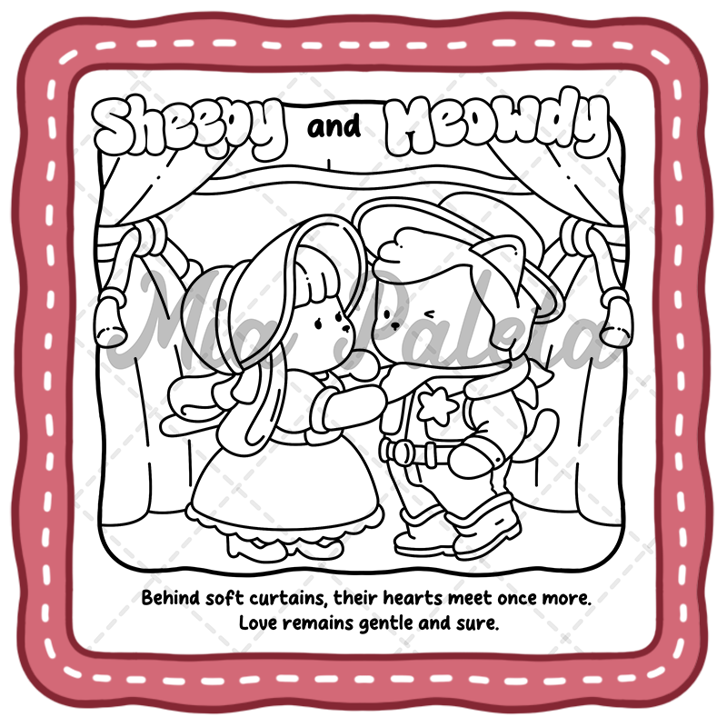 Sweet Moments is illustrated in a soft and adorable fuzzy love coloring book style. Characters are drawn with rounded shapes, gentle expressions, and warm details that make coloring easy and enjoyable.