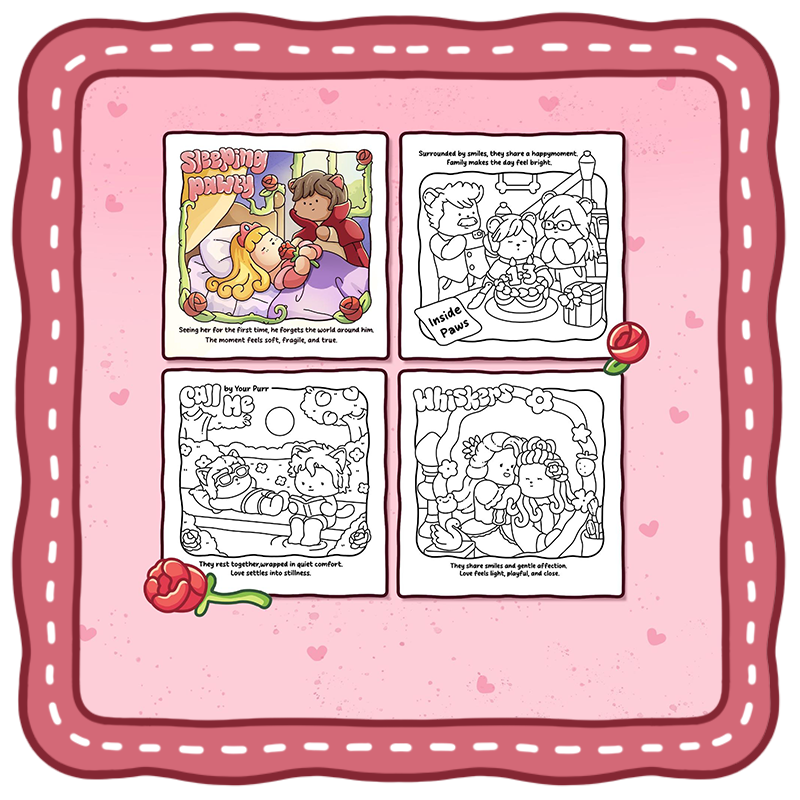 In this love story coloring book, cinematic scenes are shaped by everyday life. You’ll discover gentle family time, small happy moments with friends, peaceful days spent together, and soft, cozy moments that feel easy, calm, and light 🌸.