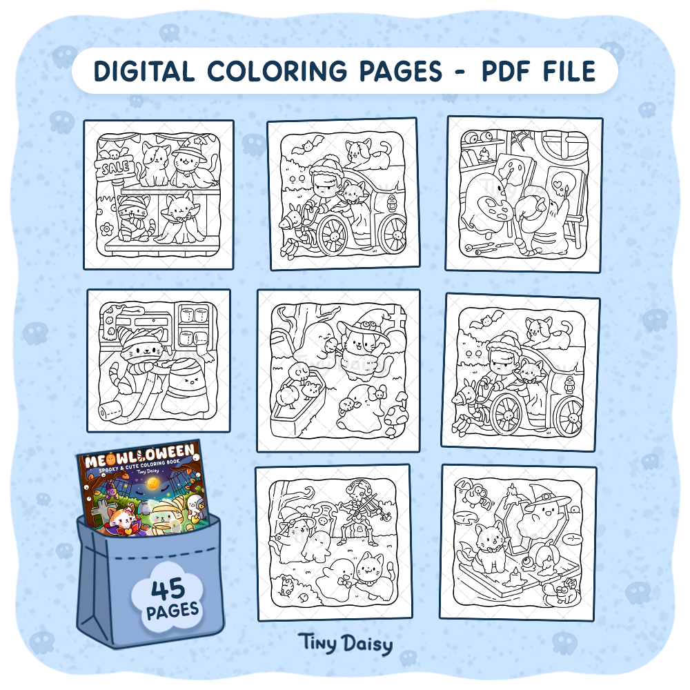 Featuring 30+ spooky-cute cat designs in the paperback edition and 45 hand-drawn illustrations in the digital edition, each page blends playful Halloween fun with soft, cozy charm. From trick-or-treat adventures and haunted houses to sweet festive scenes, this book is perfect for relaxing, smiling, and enjoying creative time during the Halloween season.