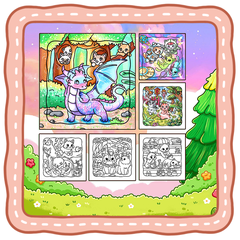 - ✨ Mythical world coloring book cat and dragon scenes