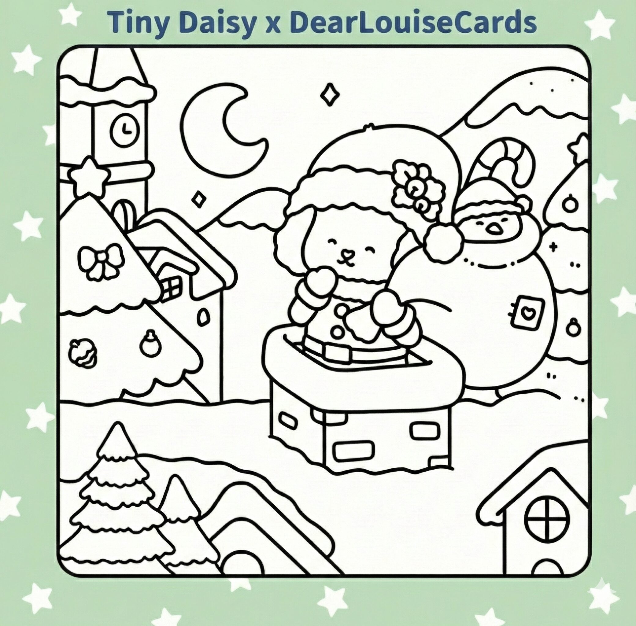The Design: A charming, cosy illustration featuring Santa’s little helper on a snowy rooftop under a starry Christmas sky, capturing a magical holiday moment. This Santa’s Helper Rooftop Christmas DIY Colouring Card is perfect for festive gifting and creative Christmas fun.