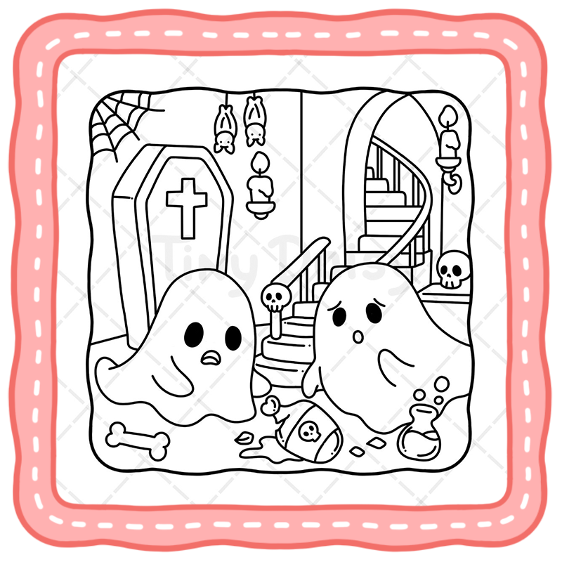 This heartwarming spooky coloring book blends gentle Halloween vibes with cozy daily life scenes, creating a perfect balance between spooky and adorable.